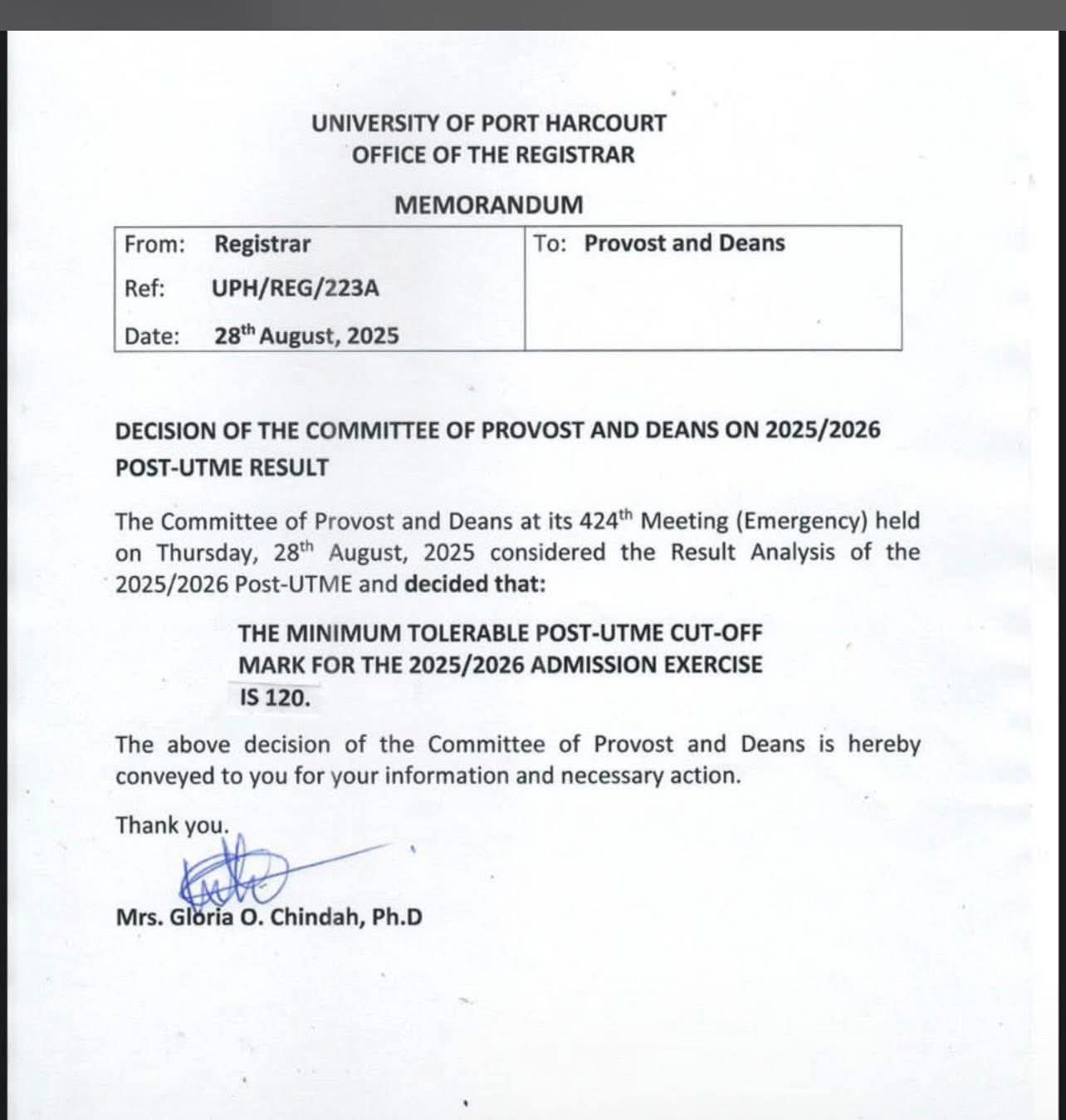 This was contained in a memorandum issued by the Registrar, Mrs. Gloria O. Chindah, Ph.D, dated Thursday, 28th August, 2025, following the 424th Emergency Meeting of the Committee of Provost and Deans.