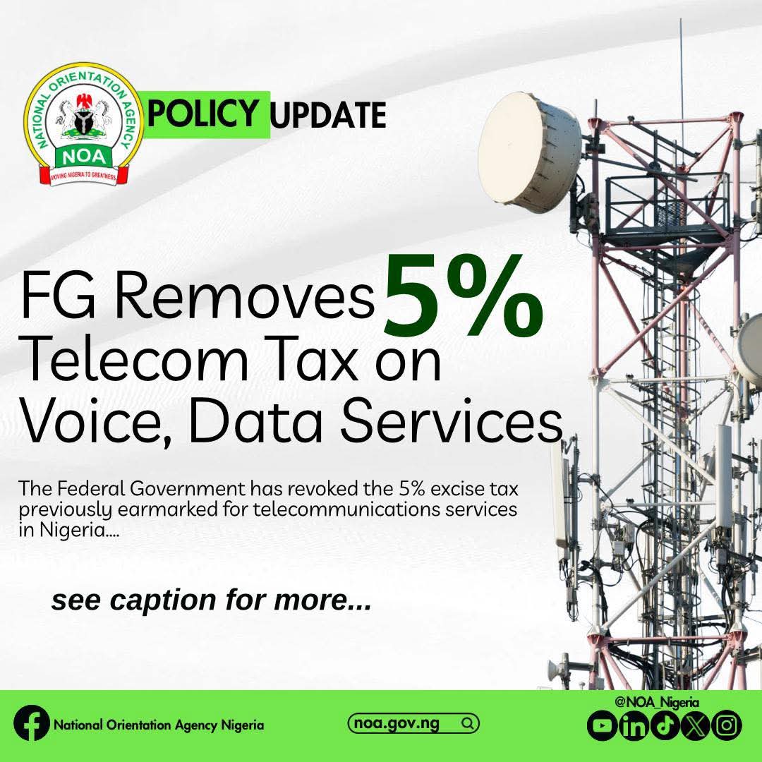 The Federal Government has announced the removal of the 5% excise duty earlier imposed on telecommunications services in Nigeria, a decision expected to ease the financial burden on millions of mobile phone users.