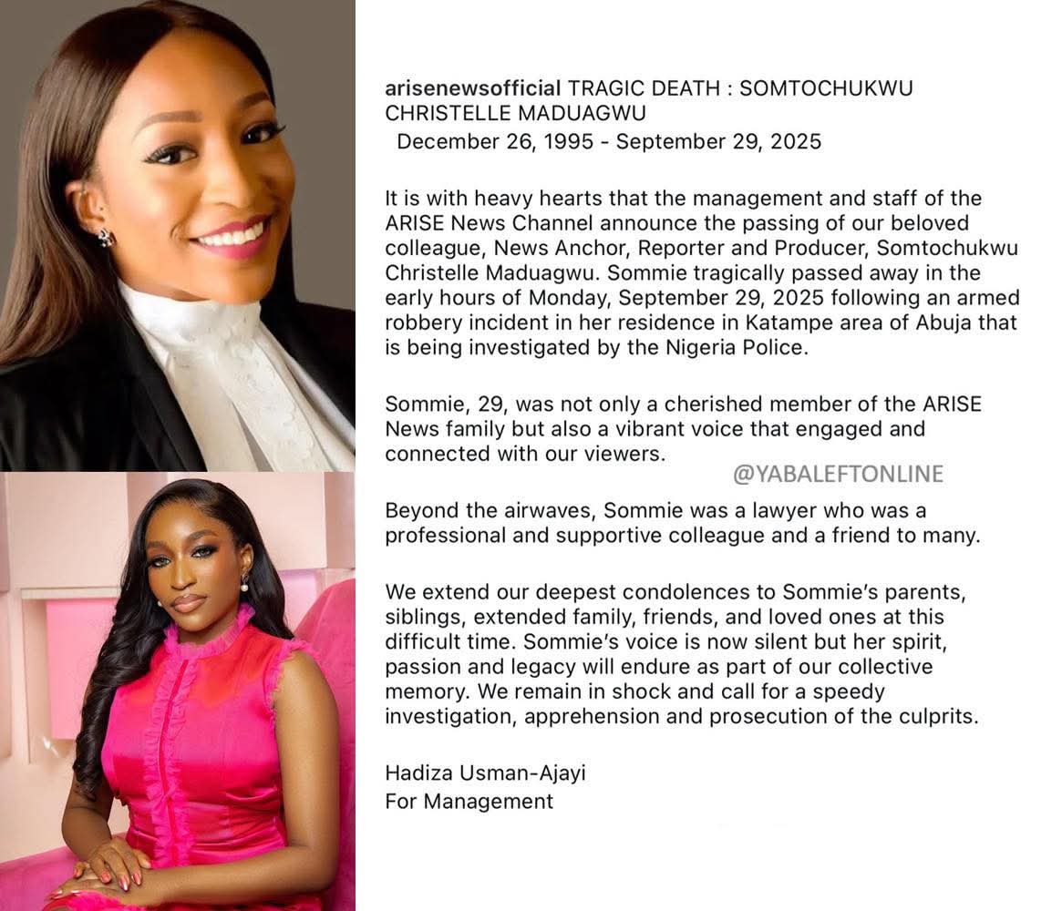 The 29-year-old news anchor, reporter, and producer, fondly known as Sommie, was killed in the early hours of Monday, September 29, 2025, during an armed robbery attack at her residence in Katampe, Abuja. The incident is currently under investigation by the Nigeria Police.