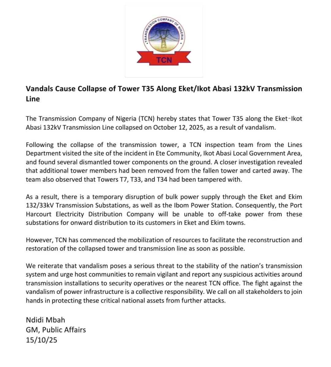 The Transmission Company of Nigeria (TCN) has confirmed the collapse of Tower T35 along the EketβIkot Abasi 132kV transmission line following an act of vandalism on October 12, 2025.